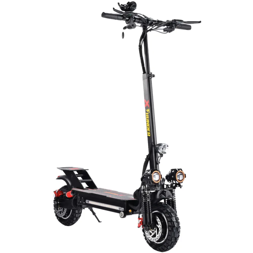 Электросамокат WS-Thunder 2400W 48V21ah - достойный представитель городского экологического транспорта. Производители оснастили данную модель производительными моторами суммарной мощностью 2400 W, которые позволяют развивать впечатляющую скорость до 50 км/час. Полный привод обеспечивает хорошую проходимость и возможность преодолевать подъемы и небольшие препятствия на пути. Во время движения по ровным городским улицам полный привод можно отключить, что уменьшит расход аккумуляторной батареи. 10-дюймовые колеса с глубоким протектором обеспечивают хорошее сцепление с дорожным покрытием, позволяя сохранять устойчивость при движении и маневрировании. Электросамокат выполнен из прочного алюминиевого сплава и выдерживает нагрузку до 155 кг, вес самого устройства при этом составляет 29 кг. Складная конструкция делает электросамокат более компактным и удобным для хранения и транспортировки. Маленькие колесики в передней части платформы позволяют катить самокат в сложенном виде, не поднимая его полностью. Система освещения включает три элемента в передней части электроскутера (основной фонарь посередине и два дополнительных по бокам), а также три габаритных огня сзади. На боковой части платформы расположена светодиодная подсветка, которая делает электроскутер более заметным в темное время суток.