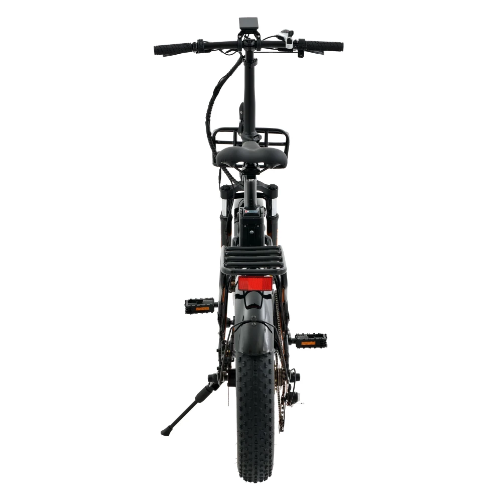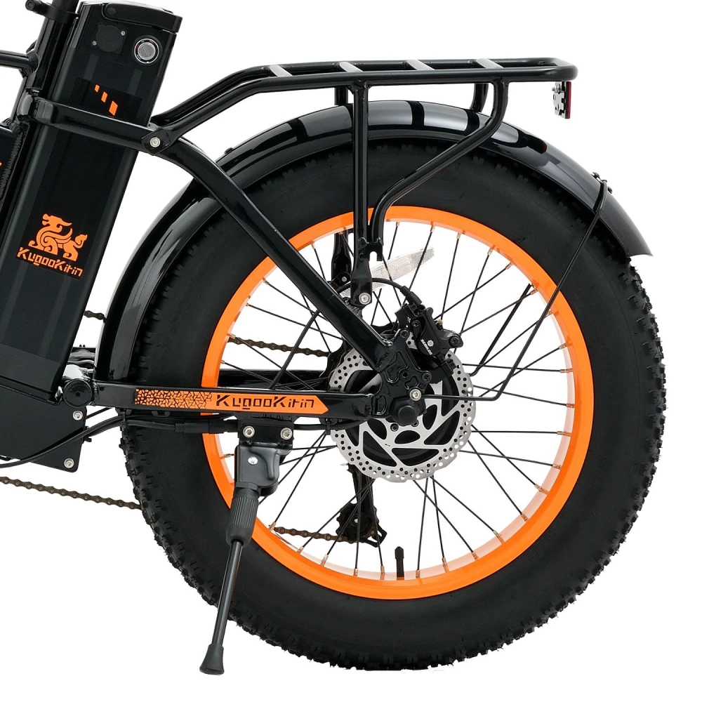 Основной цвет велосипеда черный, его диски и надписи оформлены в ярком оранжевом цвете. Это делает его уникальным среди других моделей электротранспорта. Удобное сиденье и рулевая стойка обеспечивают комфортную езду, а настройки вашего устройства позволяют управлять скоростью и другими функциями велосипеда с максимальной точностью.