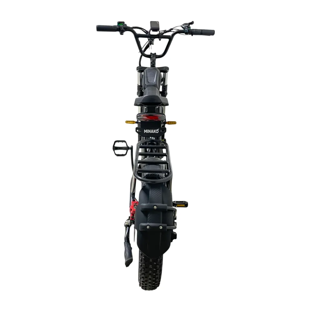 Электровелосипед Minako FOX 15Ah (Литые) в черном цвете – супербайк по лучшей стоимости предлагает купить наш интернет-магазин. Модель относится к категории быстро распродаваемой. Внешне напоминает мопед. Выглядит круто и презентабельно. Предназначен для активных пользователей, не представляющих жизни без экстрима. Прочная надежная рама, фирменная начинка обещает скоростную комфортную езду. Удобное комфортабельное седло исключает нагрузку на позвоночник, появление ощущения усталости. При мощности электромотора 1000 Вт максимальные скоростные параметры составляют 55 км/час. Емкости аккумулятора (15000мАч) достаточно для преодоления дистанции – 30 км). Батарея размещена в защитном блоке, исключающим внешнее повреждение устройства. 20-дюймовые колеса с 4-дюймовыми шинами выглядят агрессивно, накатистые, отлично сцепляемые с разными вилами поверхности. Безопасность эксплуатации гарантирована большой светодиодной фарой, фирменными тормозами и наличием бортового компьютера. Последний предоставляет полезную для райдера информацию: скоростные параметры и степень зарядки батареи. На электровелосипеде безопасно ездить по ровной дороге и пересеченной местности, в непогоду и любе время суток. Для заказа техники предлагаем сделать заявку сейчас или позвонить менеджеру.