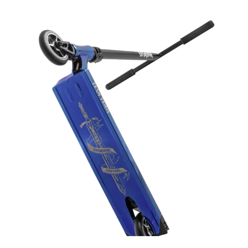 Новая модель самоката от Tech Team была названа в честь легендарного меча короля Артура - Эскалибур. Его изображение нанесено на дно деки самоката и не сотрется при катании. Размеры деки 52 см в длину и 12 см в ширину. За передним сидением дека заварена, а сзади имеет квадратные кропа. Руль самоката собран в классический образ буквы «Т» и изготовлен из прочной стали CrMo 4130. Высота руля 67.5 см и ширина 60 см. На руле установлены мягкие и удобные грипсы. Все детали самоката соединены трехболтовым зажимом рулевой системы HIC. Колеса состоят из полиуретана и имеют классический размер 110 мм. Модель EXCALIBUR оснащена подшипниками класса ABEC 9 Chrome. Они имеют высокую прочность и сохраняют набранную скорость. Сам самокат сделан из алюминиевого сплава и выпускается в двух хромированных цветах – серебристый и синий. Модель подходит для детей от 7 лет и желательно для тех пользователей, кто катает не первый год. Для безопасности над задним колесом установлен гибкий ножной тормоз.