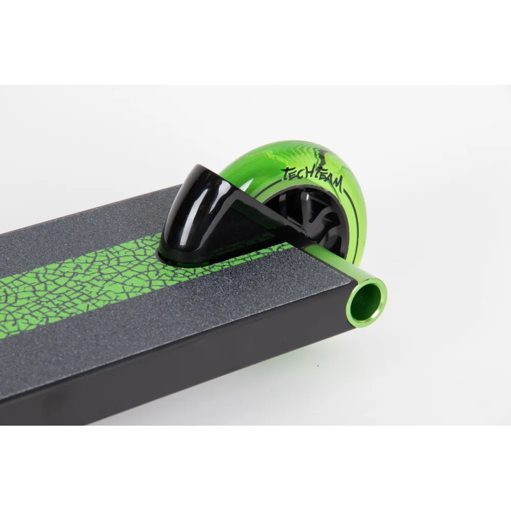 Отличительными деталями самоката является дека, передняя часть которой скошена и заварена. В качестве опоры для ноги и предотвращения случайного торможения служит стальной фендер.
